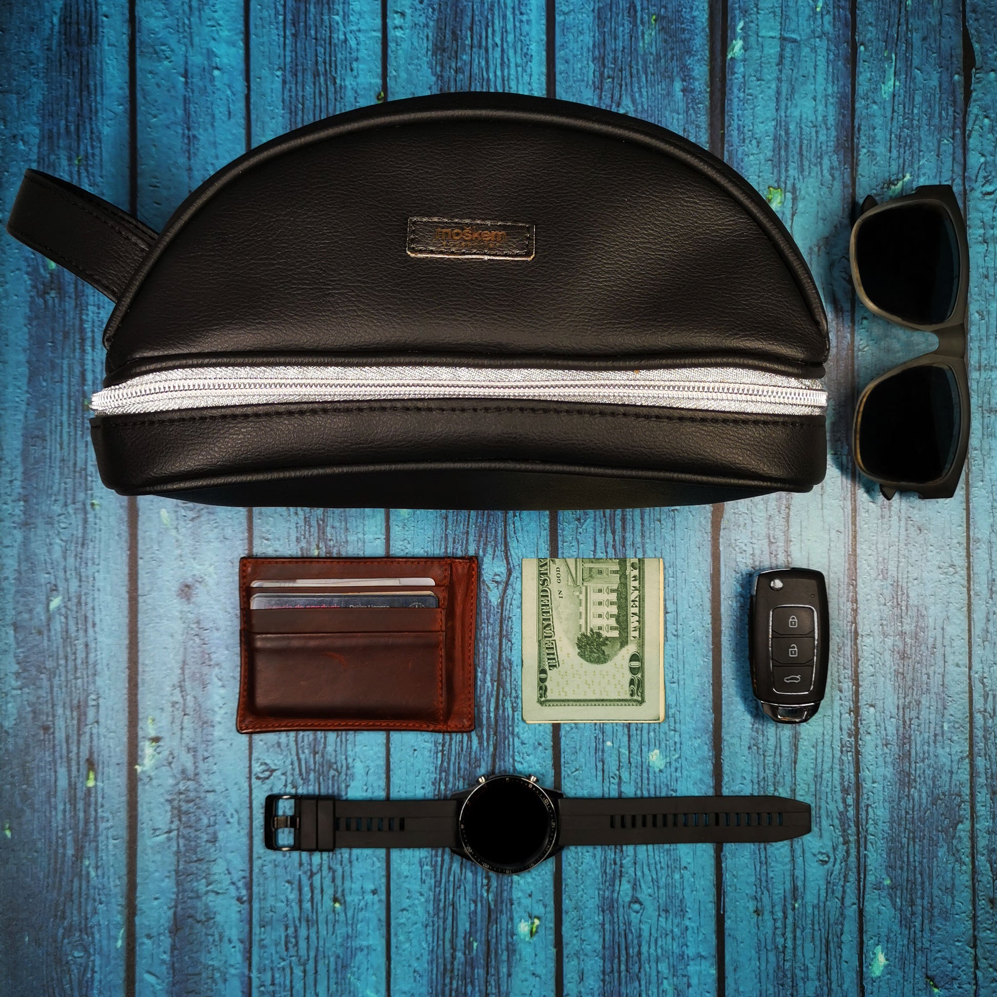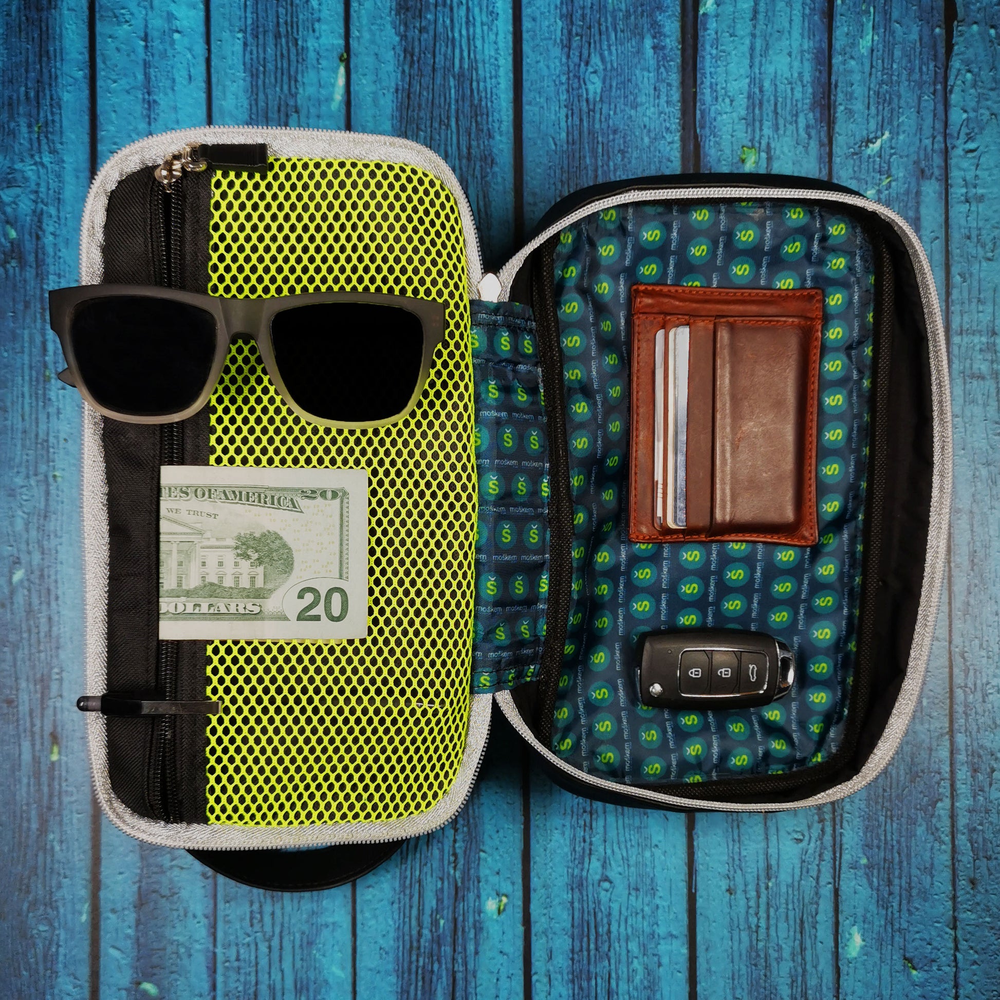 En su interior pueden caber implementos de higiene personal. Cuenta con un compartimiento inferior